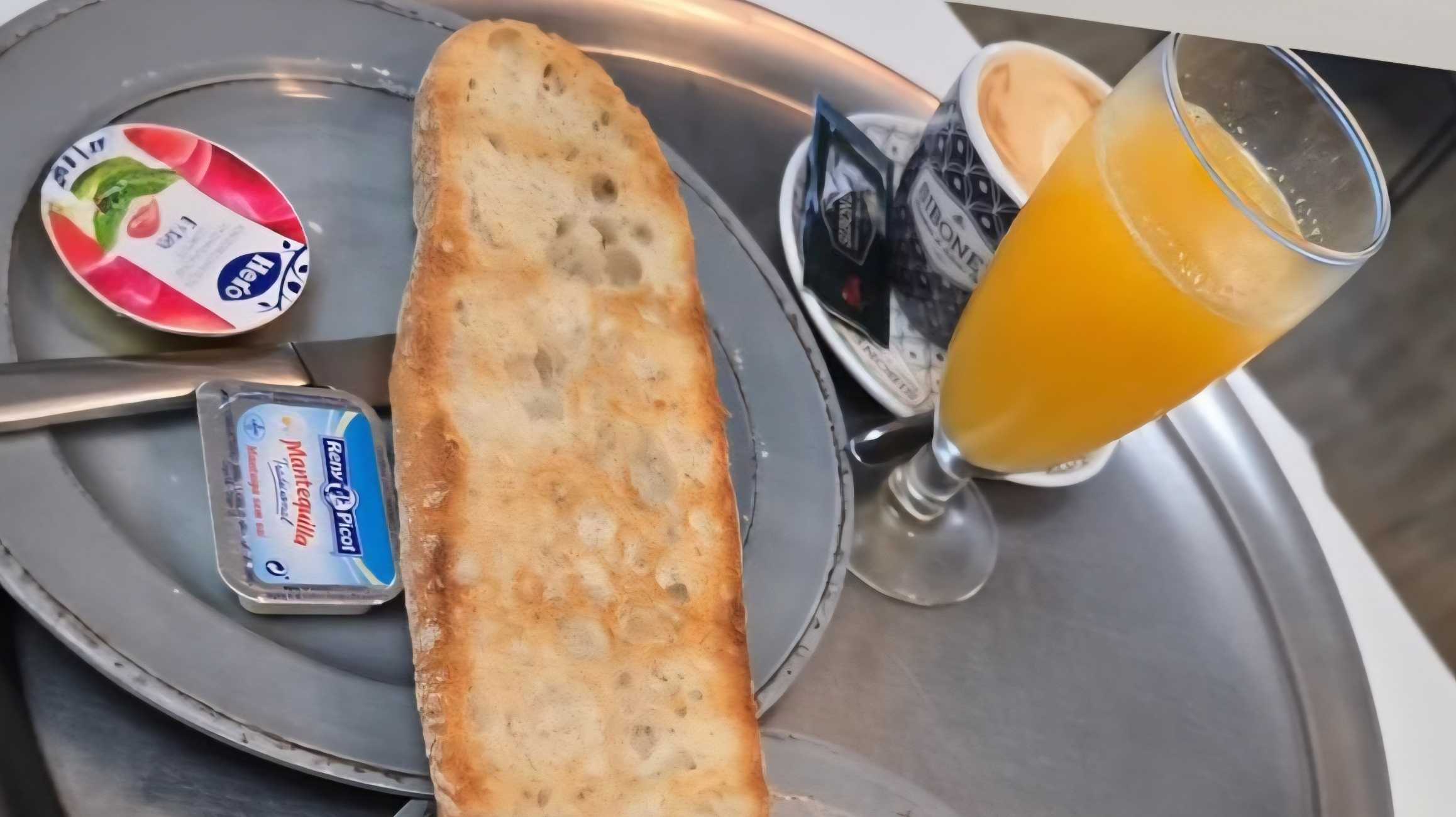 Cola Cao o Nesquik con zumo natural y croissant natural o tostada en pan artesano de mermelada y mantequilla.